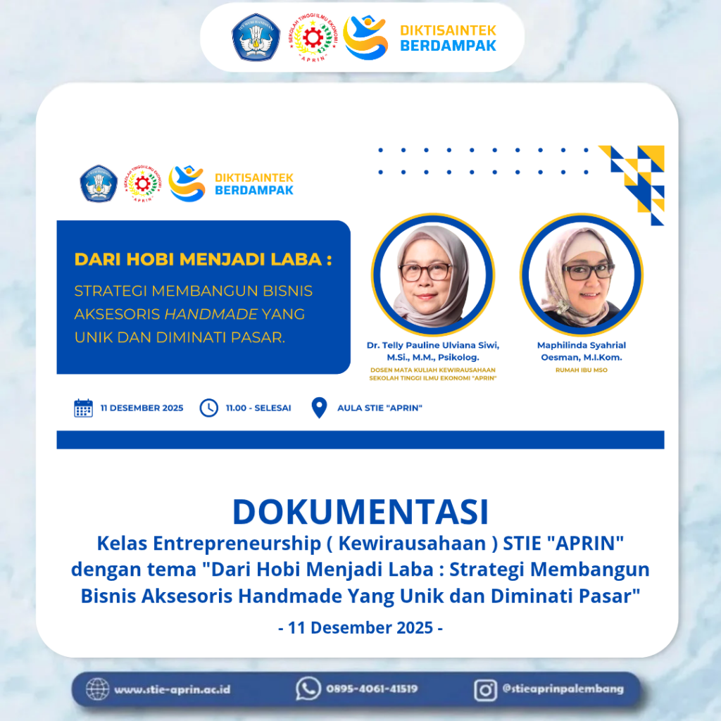 STIE “APRIN” kembali menyelenggarakan Kelas Entrepreneurship pada 11 Desember 2025 bertempat di Aula STIE “APRIN”. Kegiatan ini menghadirkan