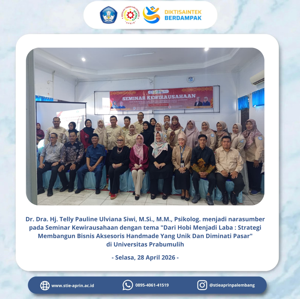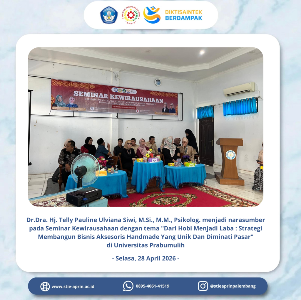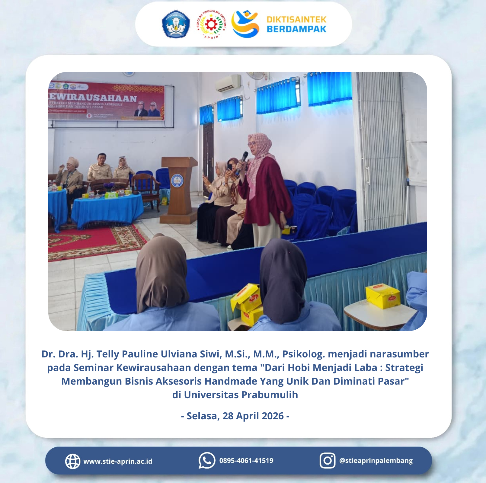 Dr. Dra. Hj. Telly Pauline Ulviana Siwi, M.Si., M.M., Psikolog, hadir sebagai narasumber dalam Seminar Kewirausahaan yang diselenggarakan oleh Universitas Prabumulih dengan mengangkat tema “Dari Hobi Menjadi Laba: Strategi Membangun Bisnis Aksesoris Handmade yang Unik dan Diminati Pasar.”