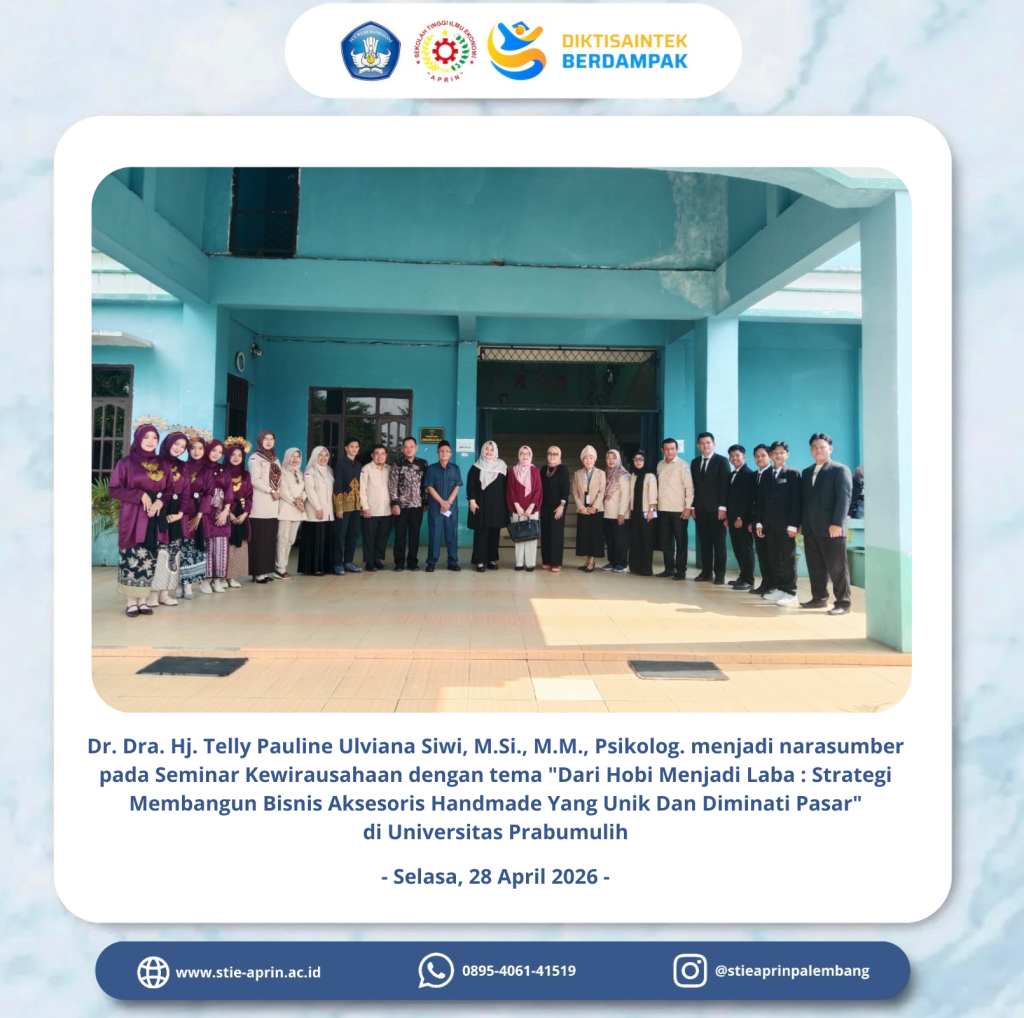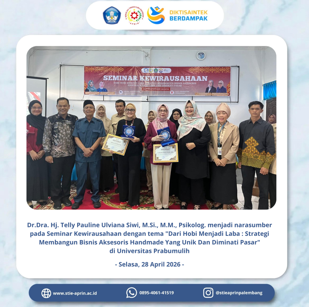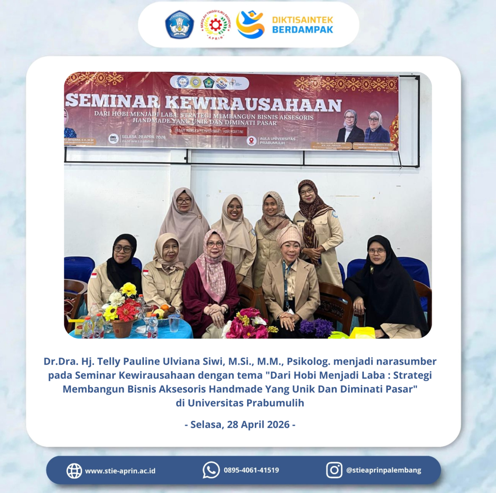 Dr. Dra. Hj. Telly Pauline Ulviana Siwi, M.Si., M.M., Psikolog, hadir sebagai narasumber dalam Seminar Kewirausahaan yang diselenggarakan oleh Universitas Prabumulih dengan mengangkat tema “Dari Hobi Menjadi Laba: Strategi Membangun Bisnis Aksesoris Handmade yang Unik dan Diminati Pasar.”
