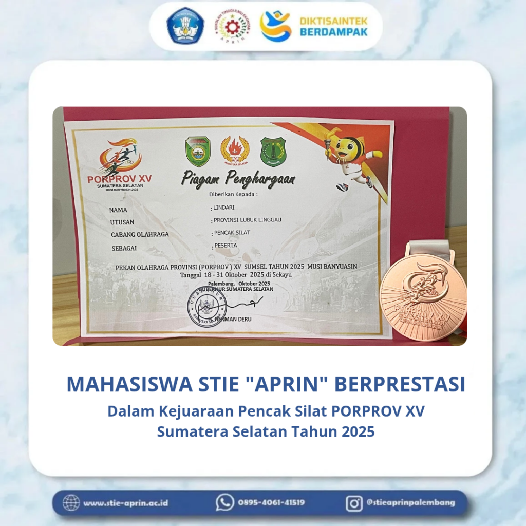 Mahasiswa STIE “APRIN” atas nama Lindari berhasil mengharumkan nama kampus lewat prestasi di ajang PORPROV XV Sumatera Selatan 2025 cabang Pencak Silat yang digelar di Musi Banyuasin.
