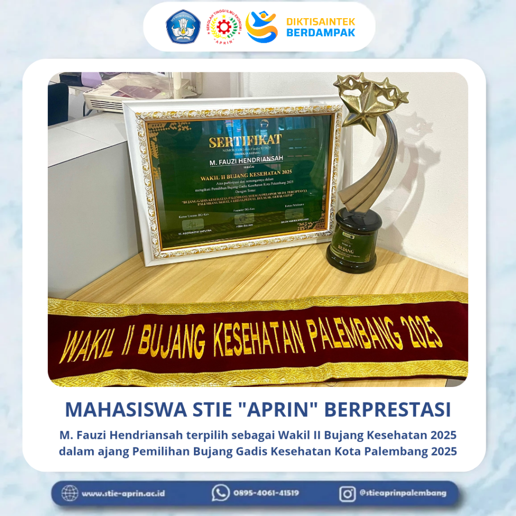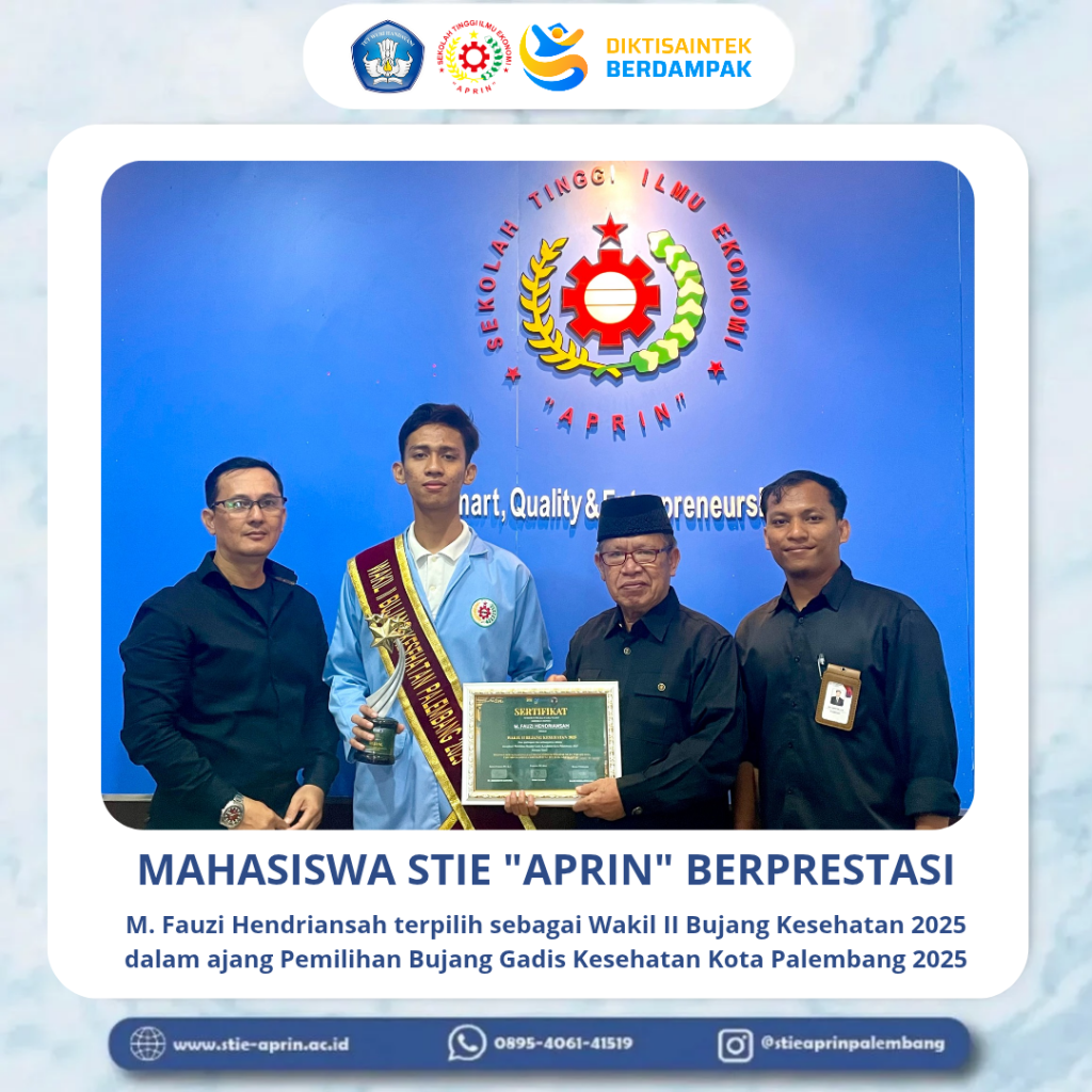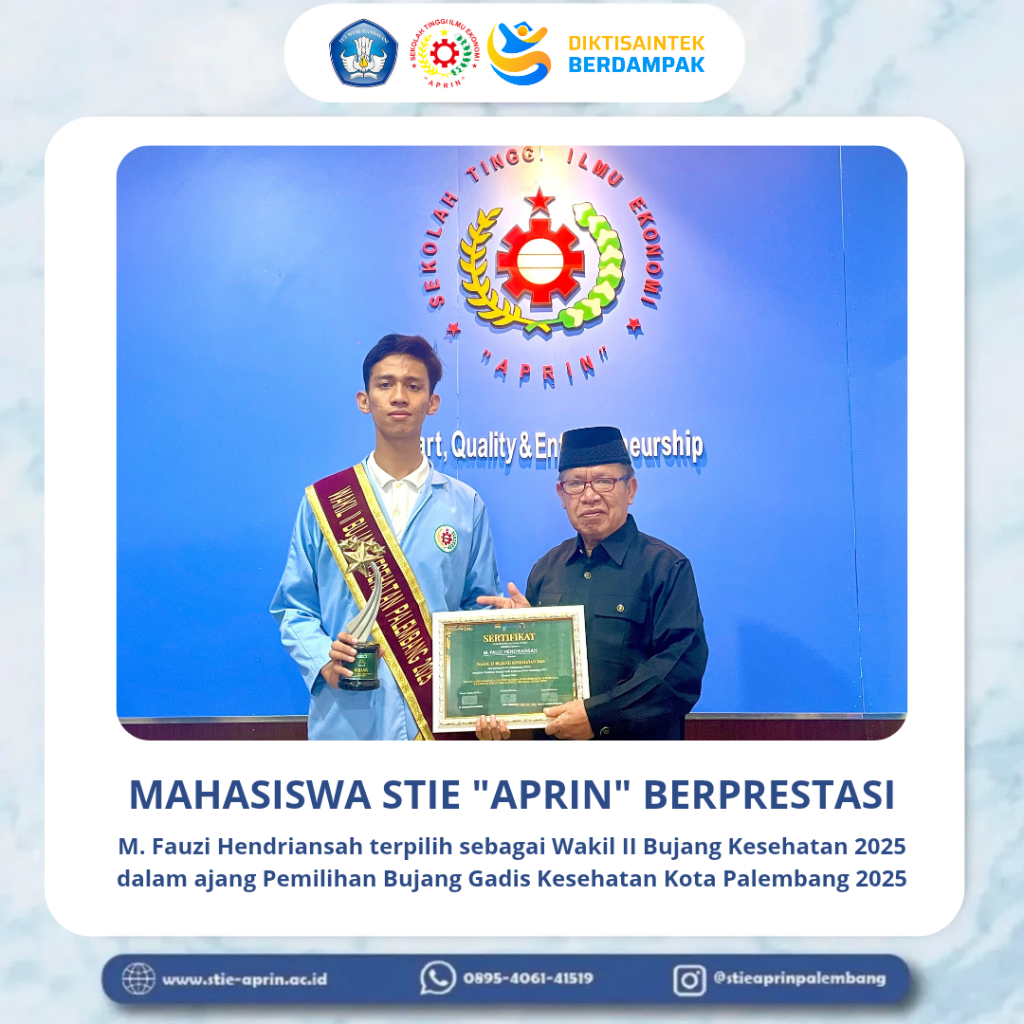 Mahasiswa STIE “APRIN” Raih Prestasi sebagai Wakil II Bujang Kesehatan Kota Palembang 2025STIE “APRIN” mengucapkan selamat dan apresiasi setinggi-tingginya kepada mahasiswa berprestasi, M. Fauzi Hendriansah, atas capaian gemilangnya sebagai Wakil II Bujang Kesehatan 2025 dalam ajang Pemilihan Bujang Gadis Kesehatan Kota Palembang 2025.